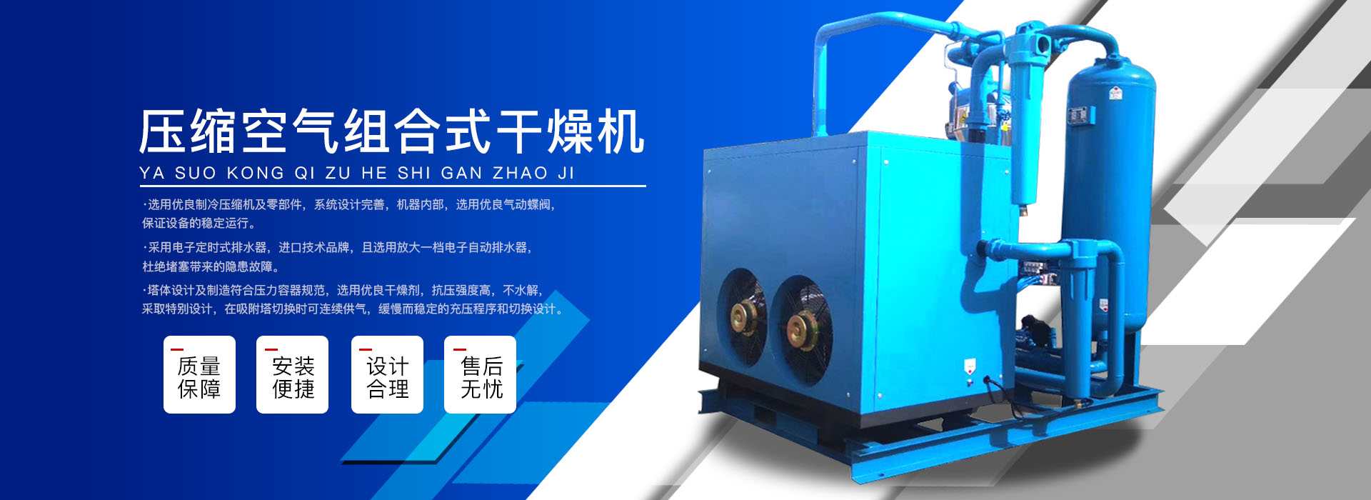 本公司系中國科學院、重鋼院、機電技術設計院、氣動技術研究所等相關專家合作的具有雄厚技術力量的高科技實體,是一個專業從事各種氣體干燥凈化及分離純化設備研究開發(fā)及推廣應用的高科技公司。公司積多年對壓縮空氣凈化設備的生產技術和銷售經驗,并在消化吸收國外先進技術的基礎上,結合國內實際工況特點,研制出適合國內外廣大用戶的“滬盛”牌HSD系列壓縮空氣冷凍式干燥機、吸附式干燥機、后部冷卻器、預冷機組、工業用冷水機組和HF系列壓縮空氣高效精密過濾器(國產濾殼,美國漢克森HANKISON濾芯)等13大系列計300多種規(guī)格產品。并且新研發(fā)出燥式干器, 廣泛應用于電力、冶金、電子、機械、石油、化工、汽車制造、紡織、化纖、輕工、造紙、橡膠、儀表、食品、空氣、卷煙、生物、醫藥、日化等行業,在國內同行業中一直處于領先地位。